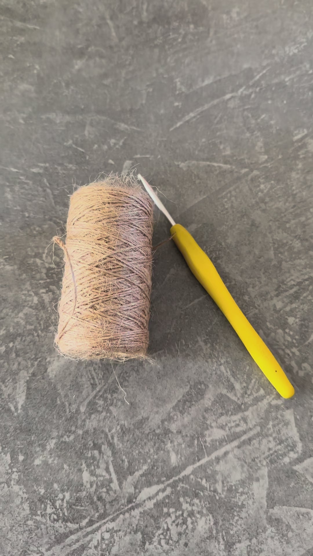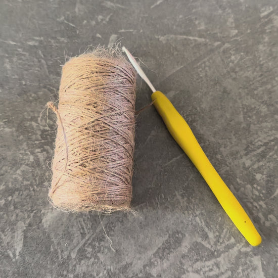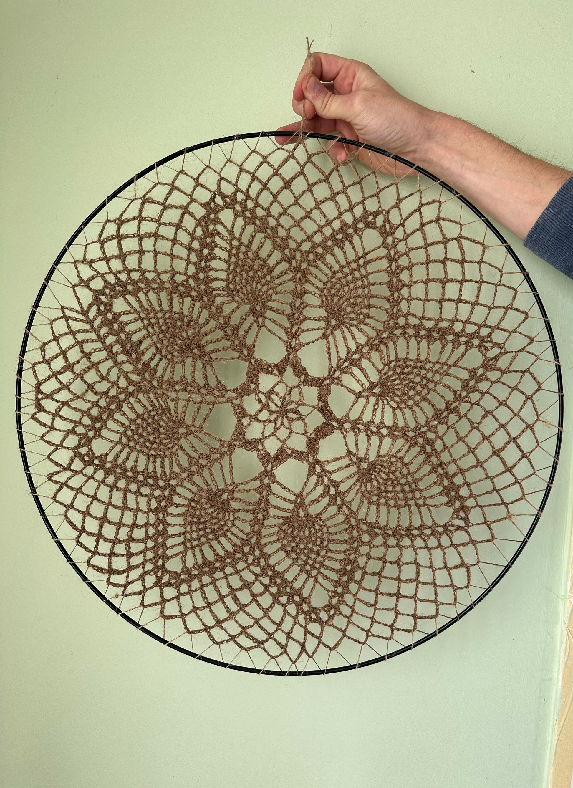 Une grande décoration de 50 cm, crochetée en cordelette de toile de jute.